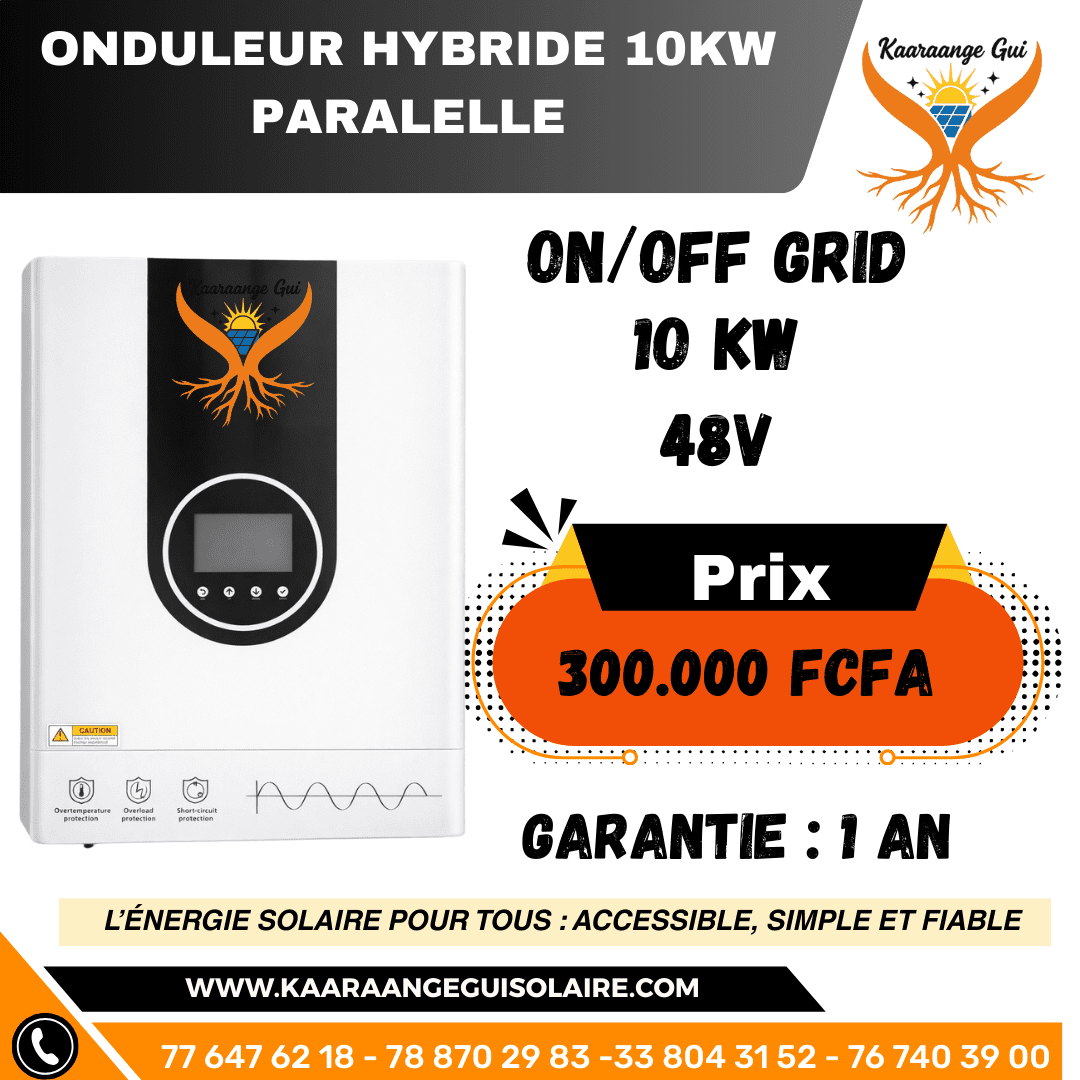 ⚡ Caractéristiques principales Puissance nominale : 6 200 W Technologie hybride : Solaire / Batterie / Réseau Rendement élevé jusqu’à 97 % Double sortie de charge avec gestion prioritaire Compatible batteries 48V (Lithium & plomb-acide) Design robuste orange & noir 🔆 Entrée photovoltaïque (PV) Tension nominale MPPT : 240 VDC Plage de tension PV : 60 – 450 VDC Tension PV maximale : 500 VDC Courant PV max : 22 A Puissance PV maximale : 6 500 W Courant de charge solaire max : 120 A 👉 Convient parfaitement aux installations solaires domestiques de puissance moyenne. 🔌 Sortie AC / Réseau Tension de sortie : 220 / 230 / 240 V AC Courant nominal : 27 A Fréquence : 50 / 60 Hz Facteur de puissance : > 0,99 Plage tension réseau : 195 – 253 V Rendement DC/AC : 97 % 🔄 Double sortie de charge Puissance totale : 6 200 W Charge principale max : 6 200 W Charge secondaire max : 2 066 W Coupure charge principale : 52 VDC Reprise charge principale : 54 VDC 👉 Permet de protéger les équipements essentiels (éclairage, TV, frigo, internet). 🔋 Batterie Tension batterie : 48 VDC Courant batterie maximal : 125 A Compatible Lithium LiFePO₄ et batteries plomb